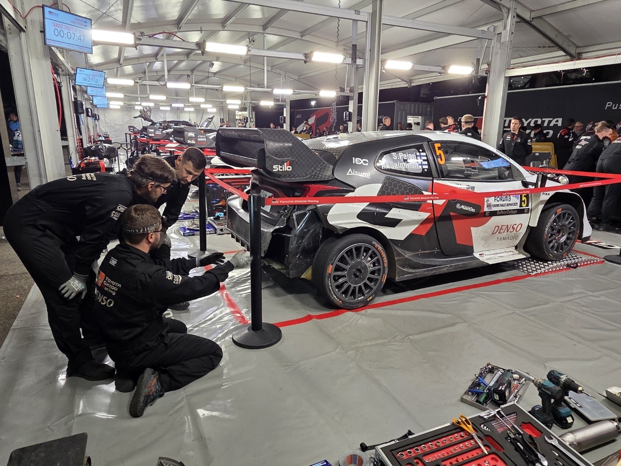 | WRC 재팬랠리 TGR-WRT 서비스 파크에서 엔지니어들이 차량의 상태를 점검하고 있다. 아이치현=서재근 기자 |