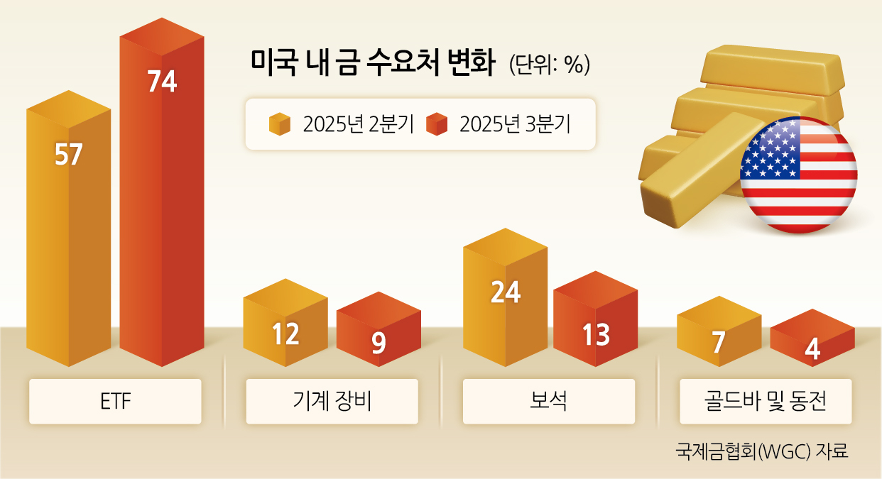 상대적인 수요뿐 아니라 전체 보석 소비량도 감소했다. 3분기 기준 미국 내 실물 금 및 보석 소비량은 전년 대비 12% 감소한 25톤을 기록했다. 트럼프 정부의 관세와 인공지능(AI)의 일자리 대체에 따른 고용 불안 등으로 인해 미국 내 소비 둔화가 나타나자 보석 및 주얼리 구매가 급격히 줄었다는 분석이 나온다. 반면, 자산가치를 보존하려는 동기가 커지면서 금 ETF 투자 수요는 오히려 늘고 있다는 설명이다.