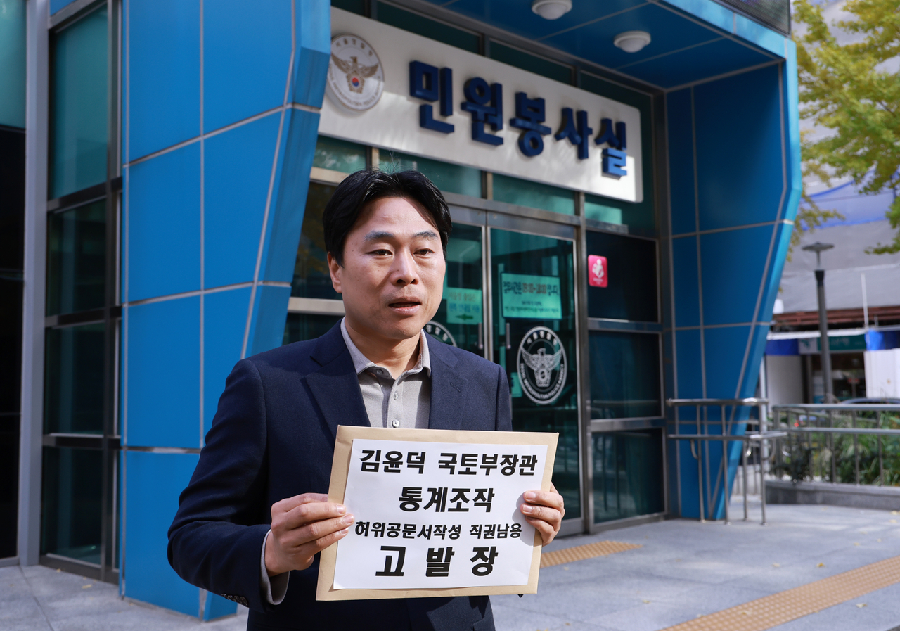 | 이종배 서울시의원이 9일 서울 종로구 서울경찰청 앞에서 김윤덕 국토교통부 장관이 10·15 대책을 발표하며 9월 부동산 통계를 의도적으로 배제했다는 의혹을 주장하며 고발장을 제출하기 앞서 입장을 밝히던 모습. <연합> |