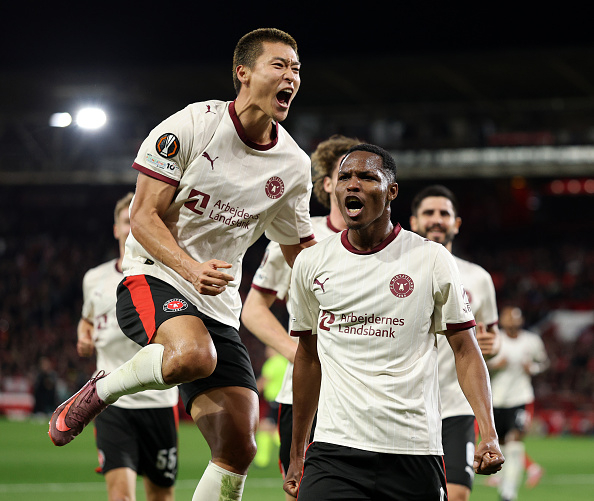 | 조규성이 지난달 2025-2026 유럽축구연맹(UEFA) 유로파리그 페이즈 2차전 노팅엄전에서 우스만 디아오(오른쪽)가 선제골을 터뜨리자 환호하고 있다. [게티이미지] |