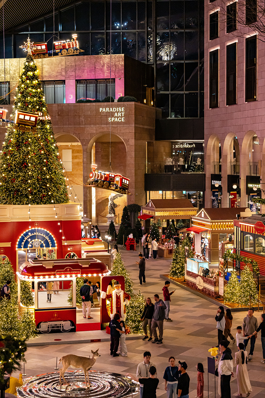 먼저 파라다이스시티 ‘플라자’의 실내 대형광장은 오는 14일부터 동화 속 기차역을 연상케 하는 대규모 크리스마스 마켓 팝업으로 변신한다. 2700평 규모의 공간에 볼거리와 즐길거리를 제공하는 시그니처 연말 행사다.
