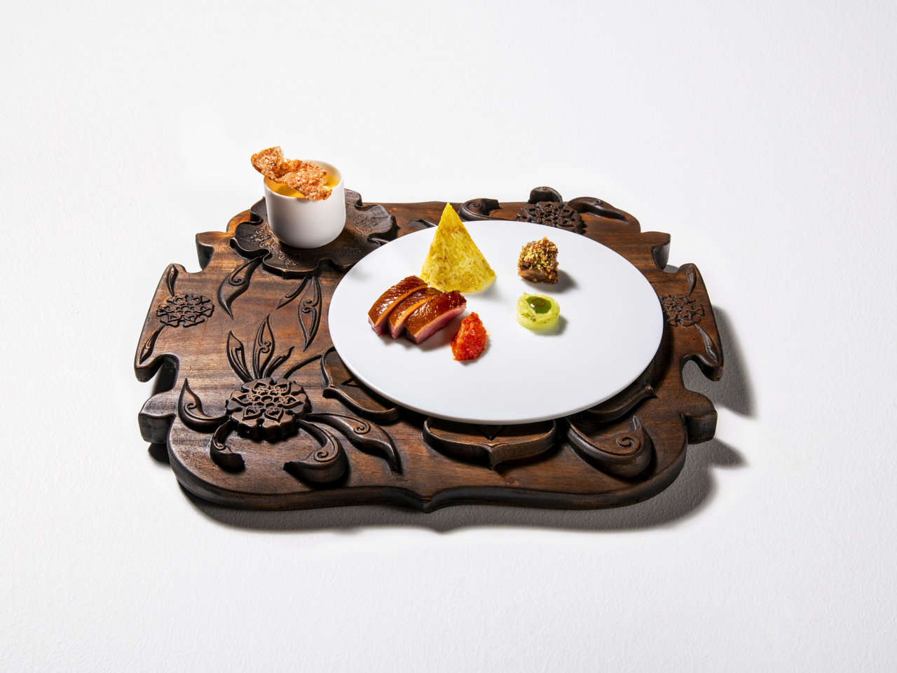 “오리를 홍콩 전통 방식으로 살짝 익힌 후, 빨간 와인 식초로 윤기를 더해 색감을 냈습니다. 이를 사탕수수로 훈연해 달콤하고 신선한 훈연 향을 살렸죠. 제가 표현하고 싶었던 ‘홍콩식 로스트’입니다.”