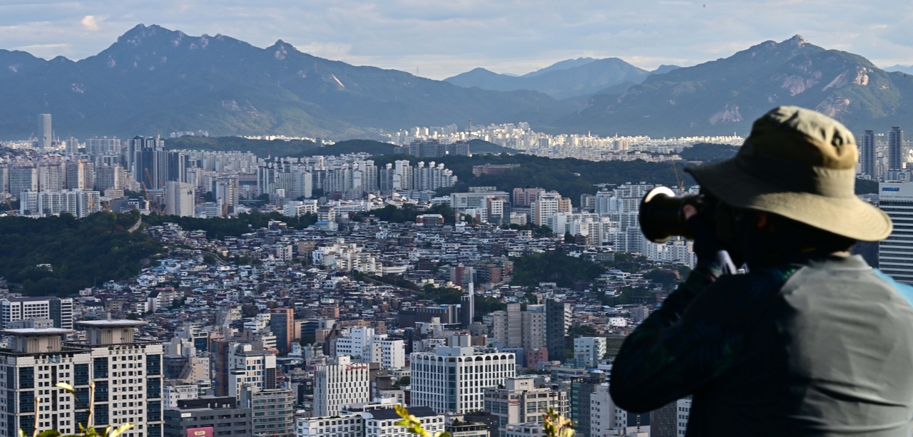 | 지난 10월 15일 서울 남산에서 한 시민이 서울 시내 아파트를 바라보고 있다. 이상섭 기자 |