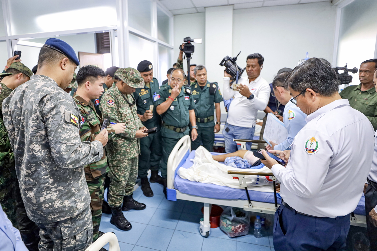 | 13일 캄보디아 반테아이메안쩨이 주를 방문한 ASEAN 감시단(AOT) 소속 요원들이 병원에서 부상자를 살펴보고 있다. [EPA] |