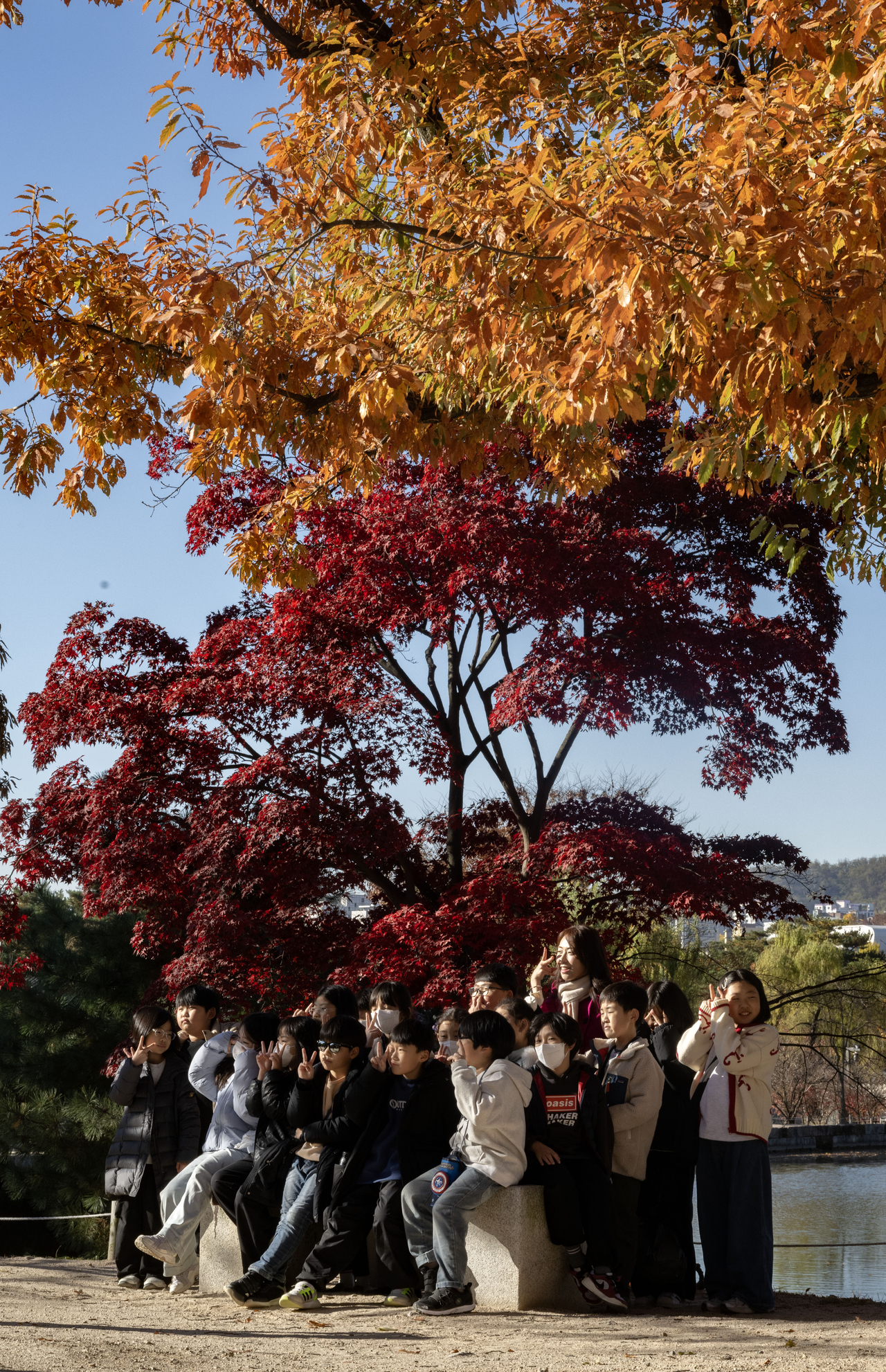 | 완연한 늦가을 날씨가 연일 이어지며 전국적으로 단풍이 절정에 달하고 있다. 14일 오전 서울 종로구 경복궁에서 견학을 나온 아이들이 울글불긋 물든 단풍을 배경으로 기념촬영을 하고 있다. 임세준 기자 |
