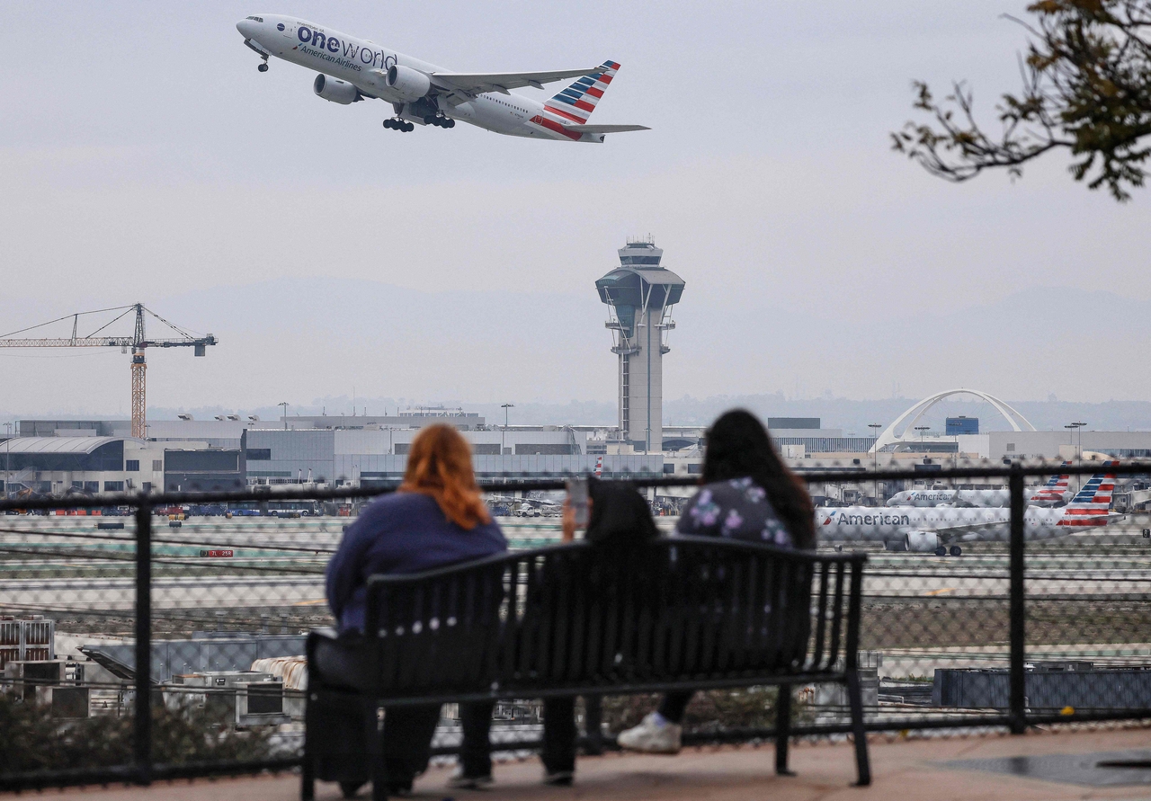 | 12일(현지시간) 미국 캘리포니아주 로스앤젤레스 국제공항(LAX) 항공 교통 관제탑 근처에서 시민들이 벤치에 앉아 아메리칸 항공 소속의 비행기가 이륙하는 모습을 바라보고 있다. [AFP] |