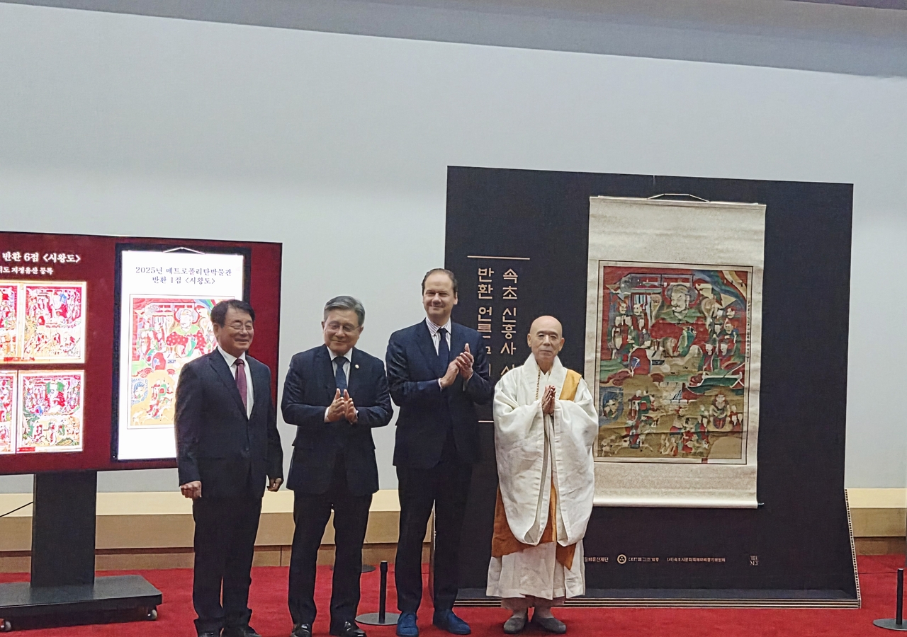 6·25 전쟁 이후 속초 지역 미군정 시기 반출된 것으로 추정되는 강원 속초시 신흥사 ‘시왕도’가 70여 년 만에 고향으로 돌아왔다. 이로써 반출된 ‘시왕도’ 10점 중 7점이 한국으로 돌아오게 됐다. 사진은 14일 서울 마포구 KGIT센터에서 열린 시왕도 반환 언론 공개회에 참석한 이상래 속초시문화재제자리찾기위원회 이사장, 허민 국가유산청장, 맥스 홀라인 메트로폴리탄미술관 관장 겸 최고경영자, 속초 신흥사 주지 적광 지혜 스님.