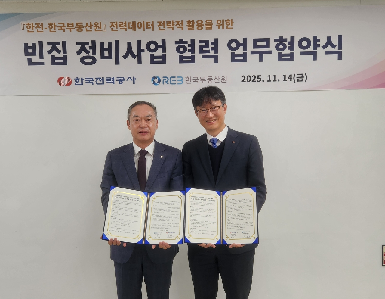 한전은 14일 서울 한전 강남지사에서 한국부동산원과 「전력데이터를 활용한 빈집 정비사업 협력」을 위한 업무협약을 체결하고 본격적인 협력체계 구축에 들어갔다. 이번 협약은 국가 차원의 빈집 정비사업에 한전의 전력데이터를 접목해 실태조사의 신뢰도를 높이고 행정 효율성을 제고하기 위한 취지로 추진됐다.