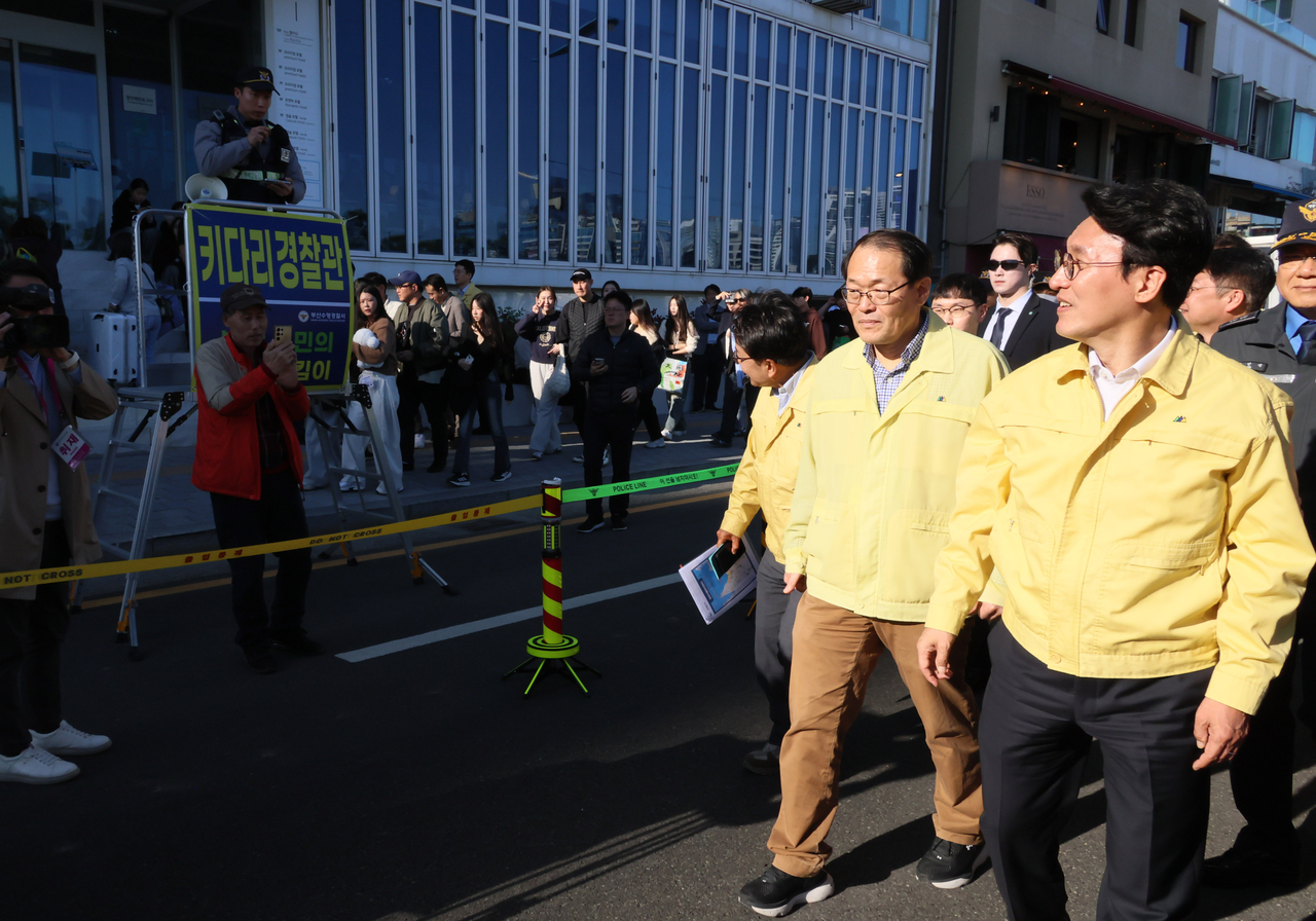 | 김민석 국무총리가 15일 부산 광안리해수욕장 일대를 돌아보며 부산불꽃축제 안전관리상황을 점검하고 있다. [연합] |