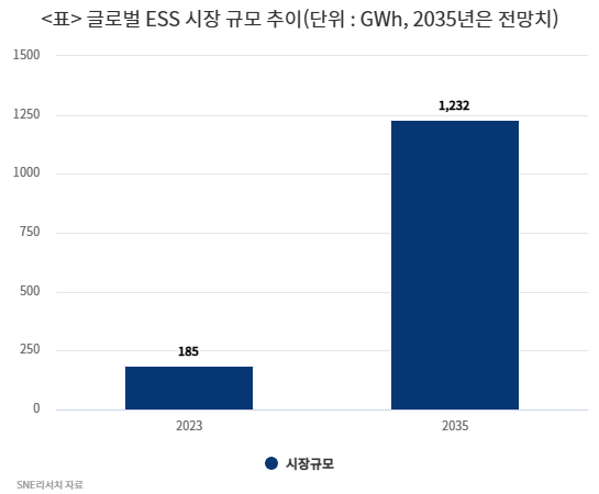 적자에 시달리고 있는 다른 동박 업체들도 ESS용 동박 판매량 확대에 나서고 있다. AI 데이터센터, 신재생에너지 등으로 ESS 시장이 성장하고 있는 만큼 ESS용 동박 수요도 고공행진할 가능성이 크기 때문이다. 시장조사업체 SNE리서치에 따르면 글로벌 ESS 시장 규모는 2023년 185GWh(기가와트시)에서 2035년 7배 가까이 성장한 1232GWh에 이를 것으로 관측된다. 동박 업체 고객사인 배터리 업체들도 기존의 전기차용 배터리 위주 사업구조에서 탈피, ESS 배터리 전환에 속도를 내고 있다.