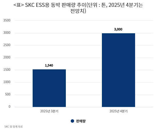 SKC의 4분기 ESS용 동박 판매량 예상치는 3000톤 이상으로 전 분기(1540톤) 대비 2배 가까이 증가할 전망이다. 전체 동박 판매량에서 ESS향 제품이 차지하는 비중은 20% 후반대이다. 올해 2분기만하더라도 8% 수준에 불과했던 판매 비중이 1년도 되지 않아 20%포인트 이상 늘어났다.