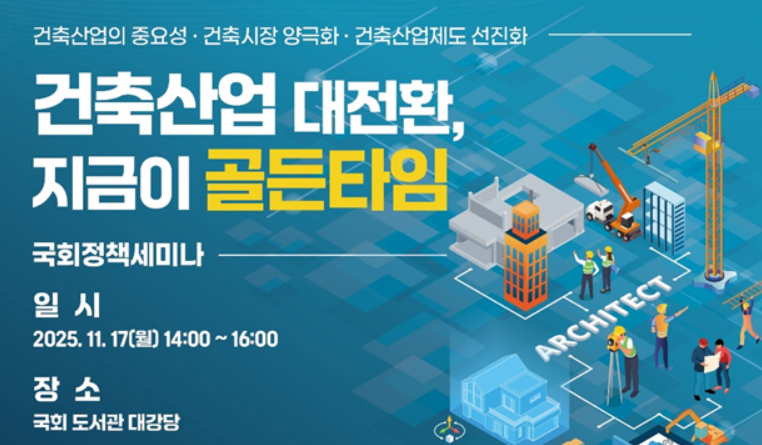 이번 토론회는 대표적인 일자리 창출 산업으로 민생경제 활력 견인 산업인 ‘건축’의 제도적 한계 및 문제점을 분석해 이에 대한 혁신 방안을 찾고자 마련됐다. 국내 건축 5단체(대한건축학회·대한건축사협회·한국건축가협회·새건축사협의회·한국여성건축가협회)와 건축공간연구원을 포함한 학계·산업계 관련 전문가 300여명이 참석할 예정이다.