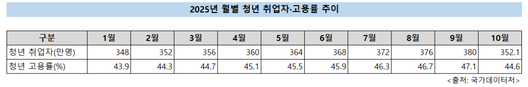 17일 국가데이터처에 따르면 올해 1~10월 청년층(15~29세) 고용률은 45.13%로 2022년 이후 3년 연속 하락했다. 월별 기준으로는 18개월 연속 떨어져 금융위기 이후 최장 기록을 썼다.
