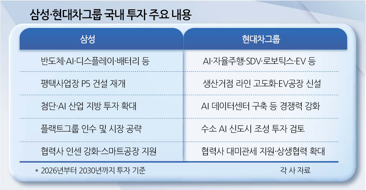 삼성그룹과 현대자동차그룹이 미래 주력 산업의 신성장 동력을 확보하고, 대한민국 경제에 활력을 불어넣기 위한 대대적인 투자에 나선다. 인공지능(AI)을 비롯해 반도체·로보틱스·전기차·배터리·디스플레이 등 핵심 사업을 아우르는 투자로, 한국을 첨단 산업의 세계적 요충지로 키우겠다는 구상도 담겼다.