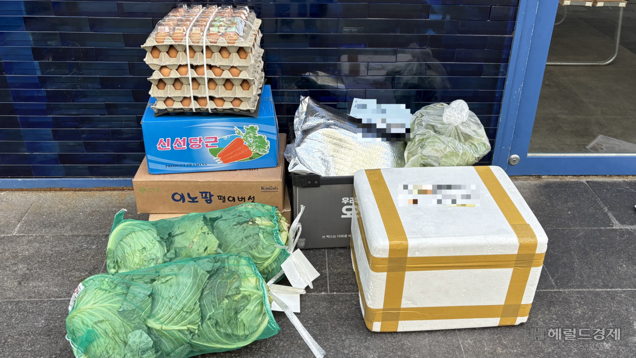 | 지난 11일 서울 서대문구 신촌역 인근 음식점 앞에 새벽배송 상품들이 놓여 있다. [사진=박연수 기자] |