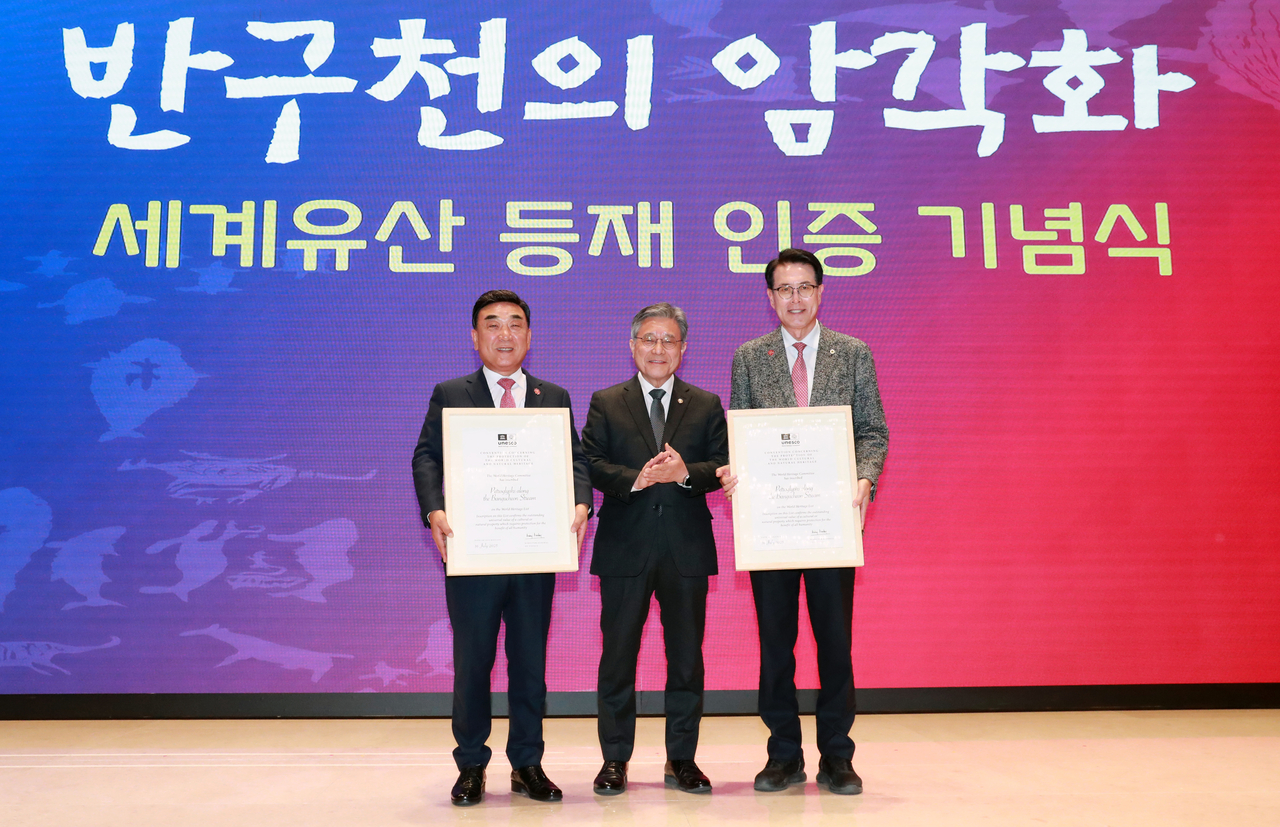 허민 국가유산청장은 울산시가 18일 오전 10시 30분 롯데호텔울산 2층에서 마련한 ‘반구천의 암각화, 유네스코 세계유산 등재 인증 기념식’에서 유네스코 세계유산위원회가 보낸 ‘세계유산 등재인증서’를 김두겸 울산시장과 이순걸 울주군수에게 전달했다.