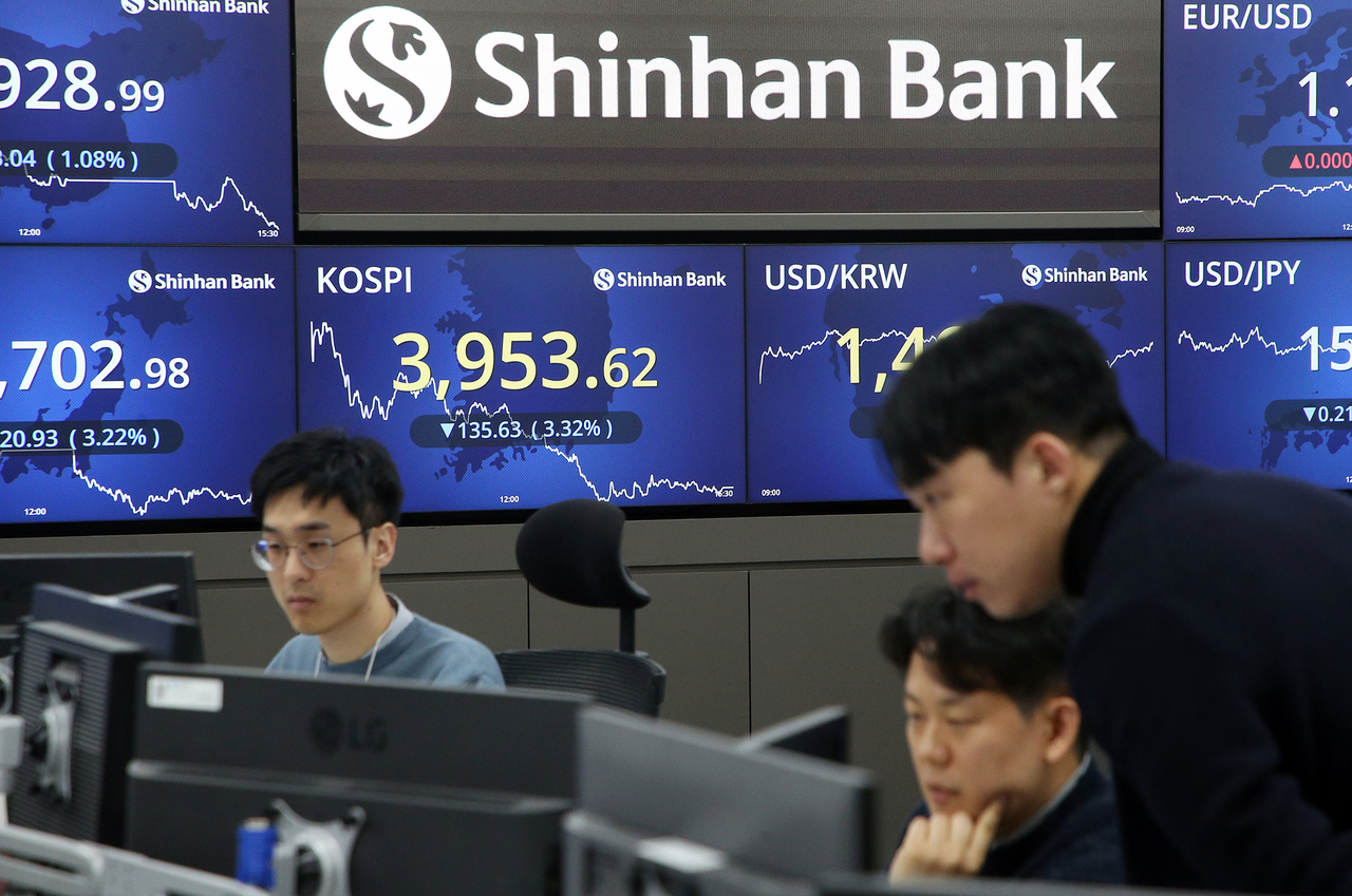| 18일 서울 중구 신한은행 본점 딜링룸에서 딜러들이 업무를 보고 있다. 이날 코스피지수는 전장보다 3.32% 내린 3953.62에 장을 마감했다. [신한은행 제공] |