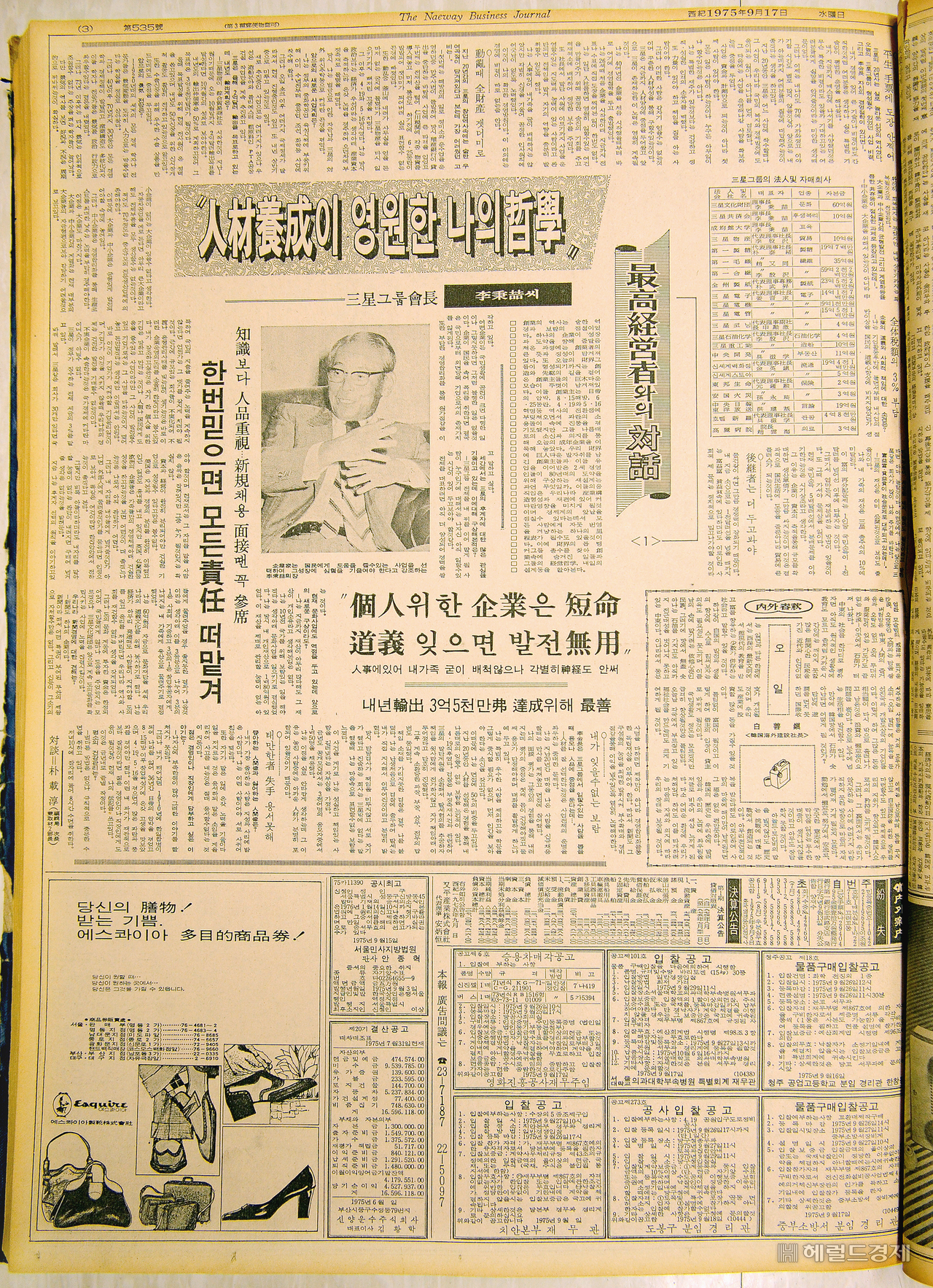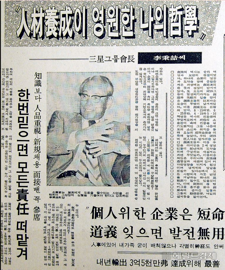 | 고(故) 이병철 삼성그룹 창업회장은 지난 1975년 9월 17일 내외경제신문과의 인터뷰에서 “한 개인을 위한 기업은 망하고 만다. 인류나 국민에게 도움을 줄 수 있는 사업이어야만 그 사업이 발전할 수 있다”며 ‘사업보국’과 ‘인재제일’로 요약되는 자신의 경영이념을 강조했다. [헤럴드DB] |