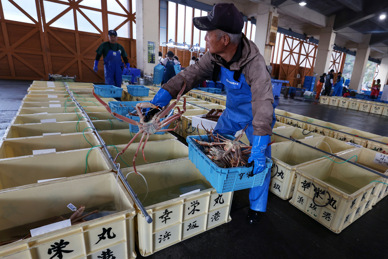 | 지난 6일(현지시간) 일본 효고현 도요오카의 하마사카 어항에서 열린 경매 첫날, 직원들이 마츠바가니 수컷 대게를 분류하고 있다. [게티이미지] |