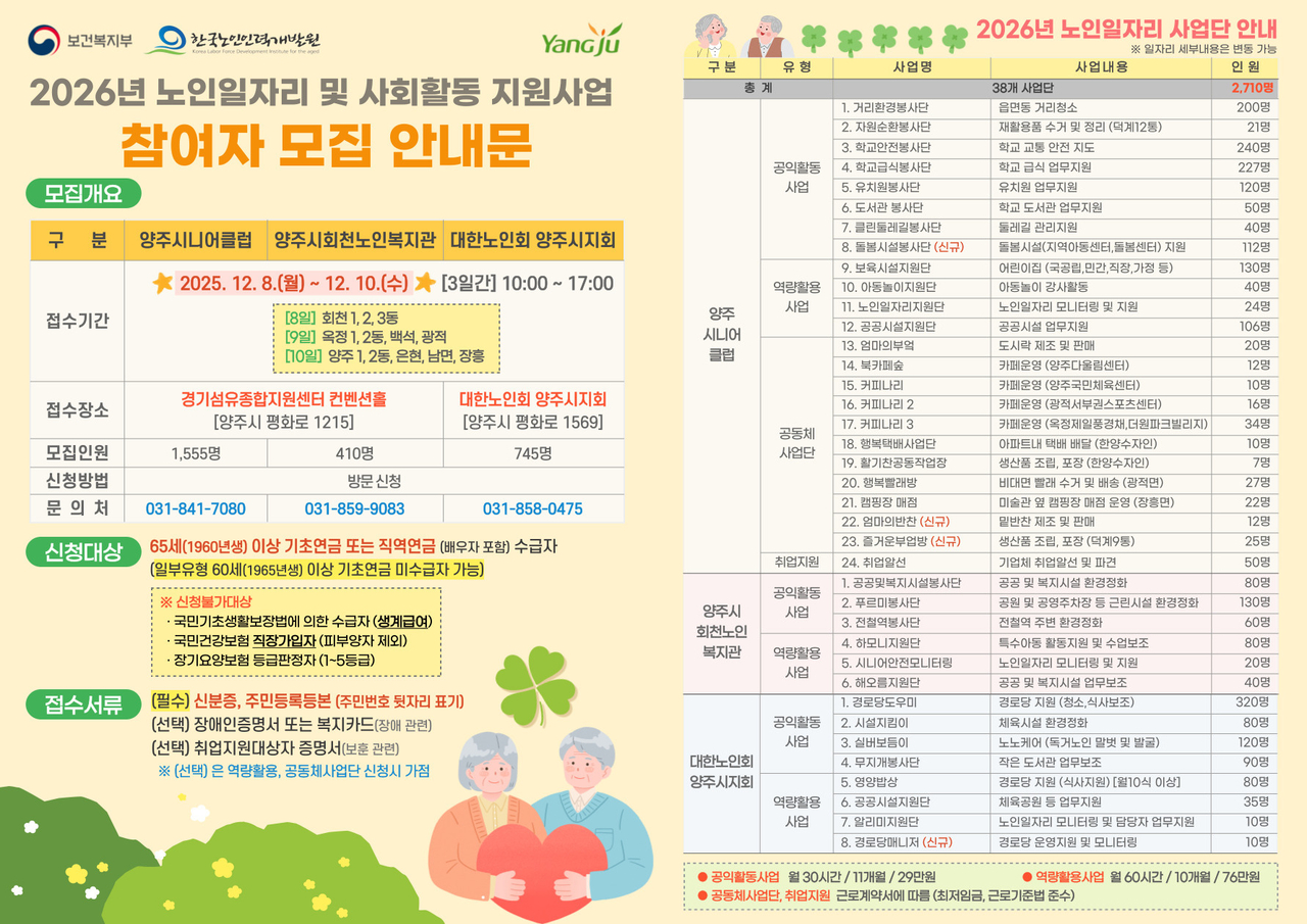 [헤럴드경제=박준환 기자]양주시(시장 강수현)가 12월 8일부터 10일까지 3일간 ‘2026년 노인일자리 및 사회활동 지원사업’ 참여자 2710명을 모집한다.