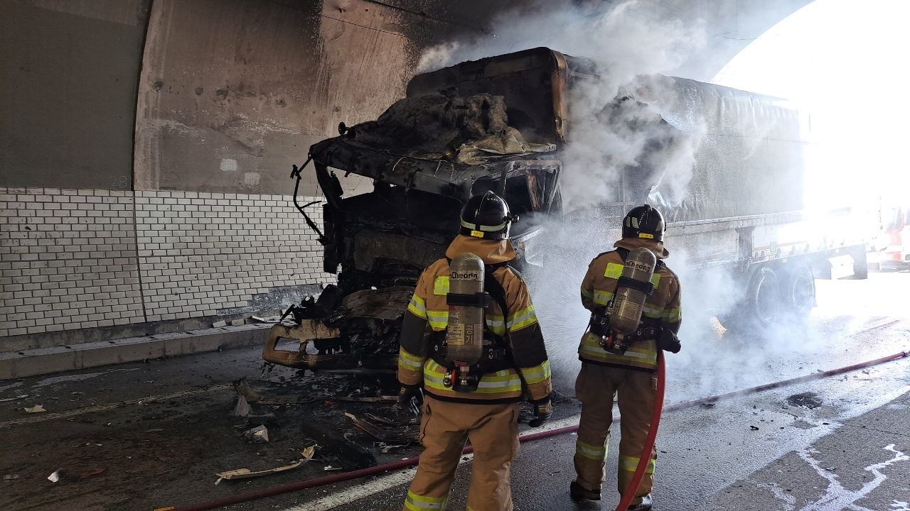 18일 경북도소방본부 등에 따르면 이날 낮 12시 34분께 경북 고령군 성산면 오곡리 중부내륙고속도로 양평 방향 58㎞ 지점 고령2터널 안에서 화물차 3대가 잇따라 추돌하며 이 중 5t 트럭 1대가 전소했다.