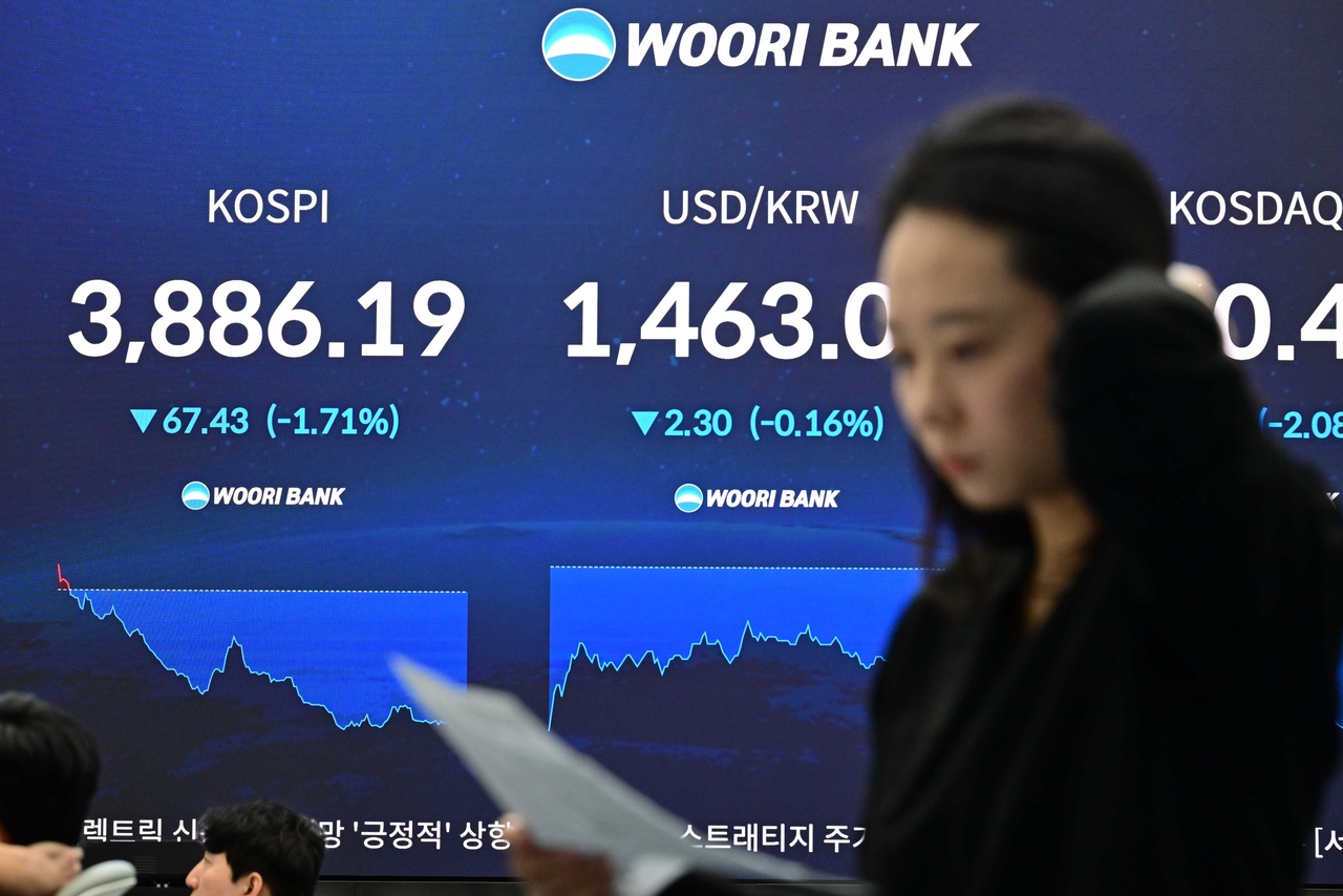 | 코스피 지수가 장중 3900선 아래로 떨어진 19일 오전 서울 중구 우리은행 본점 딜링룸 현황판에 코스피 지수, 원달러 환율, 코스닥 지수가 표시돼 있다. 이상섭 기자 [챗GPT를 사용해 수정함] |
