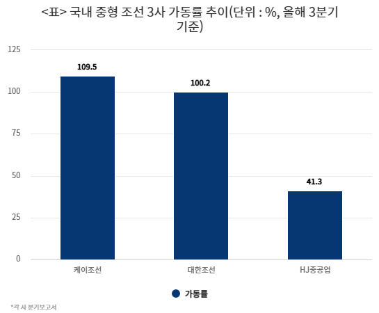 HJ중공업 조선 부문(상선 기준)은 3분기 41.3%의 가동률을 기록했다. 보유하고 있는 도크 규모 대비 크기가 작은 소형 선박을 수주하면서 가동률이 적게 측정됐을 뿐, 조선소는 사실상 풀가동되고 있다고 HJ중공업은 설명했다.