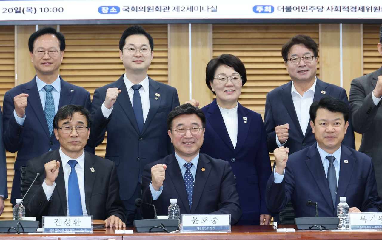 | 윤호중 행정안전부 장관이 20일 서울 여의도 국회 의원회관에서 열린 사회연대경제 성장 촉진을 위한 당정협의회에서 전성환 대통령비서실 경청통합수석비서관, 복기왕 민주당 사회적경제위원회 위원장 등 참석자들과 기념 촬영하고 있다. [연합] |
