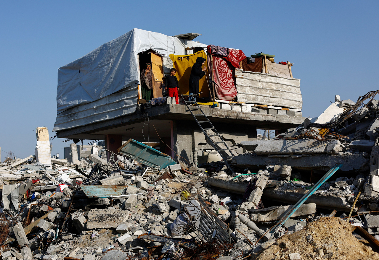 | 19일(현지시간) 이스라엘과 하마스 간의 휴전이 진행 중인 가자지구 북부에서 한 아이가 폐허가 된 건물 밖으로 나오고 있다. [로이터] |