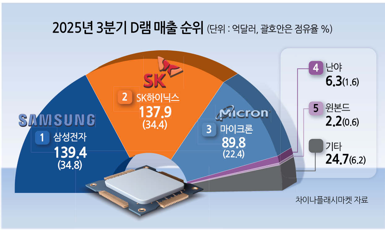 20일 시장조사기관 차이나플래시마켓(CFM)에 따르면 삼성전자의 올해 3분기 D램 매출액은 전 분기 대비 29.6% 증가한 139억4200만달러로 집계됐다. 시장 점유율은 34.8%로 매출 기준 1위에 올랐다.