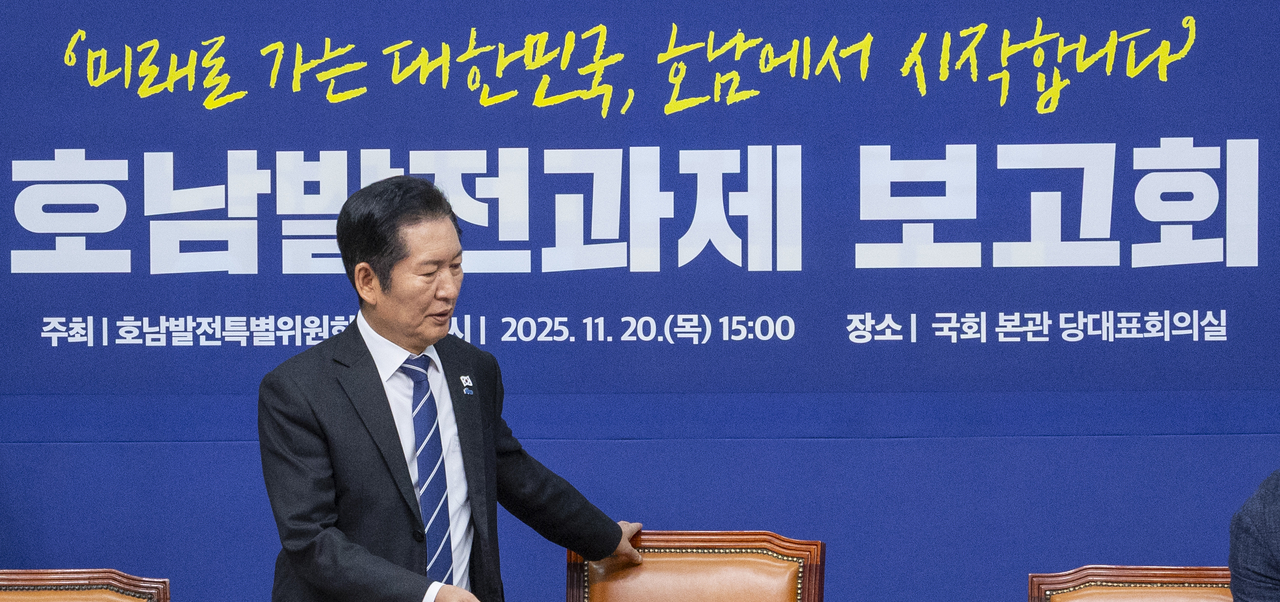 | 정청래 더불어민주당 대표가 20일 국회에서 열린 호남 발전과제 보고회에 입장하고 있다.[연합] |