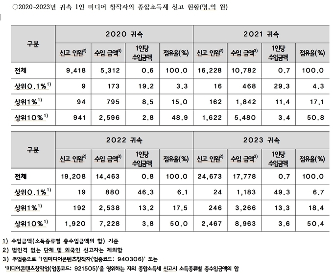 20일 국회 차규근(조국혁신당) 의원이 국세청으로부터 제출받은 자료에 따르면 2023년 기준 1인 미디어 창작자(유튜버 등) 상위 0.1%의 연평균 수입은 49억 3000만원인 것으로 확인됐다.