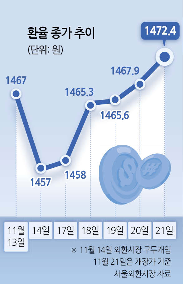 외환당국의 잇단 개입에도 원/달러 환율이 고공행진하면서 한국 경제 전반에 우려가 커지고 있다. 20일(현지시간) 뉴욕 증시가 기술주 급락 속 하락 반전하면서 원/달러 환율은 야간거래 중 1472.20원에 거래를 마치며 7개월여 만의 최고치를 기록하기도 했다. ▶관련기사 2면