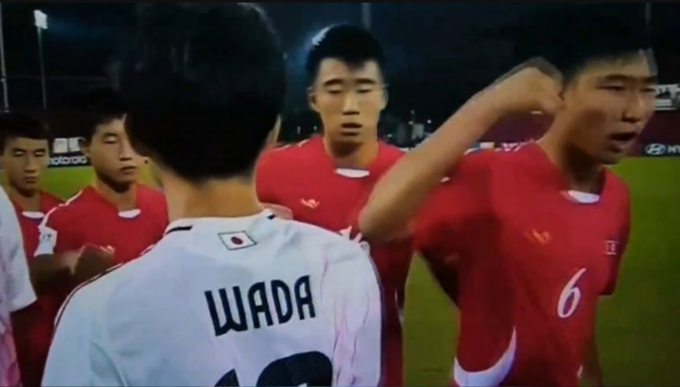 | 북한의 17세 이하 축구대표팀이 일본 선수들을 향해 주먹질 하듯 인사하고 있다. [SNS] |
