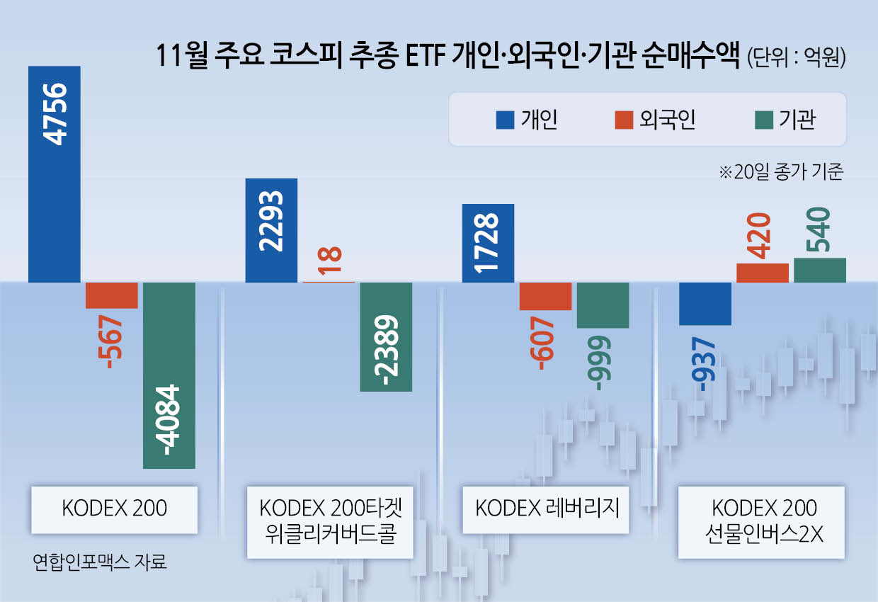 11월 변동 장세 속에서도 개인은 코스피 추가 상승에 베팅하는 상장지수펀드(ETF)에 적극 투자하고, 하락을 점치는 ‘곱버스(인버스 2배)’ 상품을 적극 매도하고 있기 때문이다.