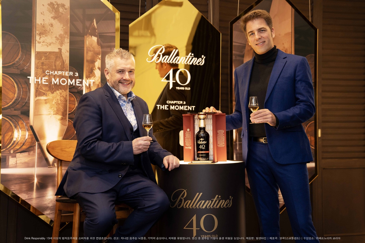 [헤럴드경제=임세준 기자] 지난 19일 서울 강남구 까사알렉시스 도산점에서 발렌타인 마스터 블렌더 샌디 히슬롭(Sandy Hyslop)과 페르노리카 코리아 마케팅 총괄 전무 미겔 파스칼(Miguel A. Pascual)이 ‘발렌타인 40년 마스터클래스 컬렉션 더 모먼트(Ballantine’s 40YO Masterclass Collection The Moment)’를 소개하고 있다.
