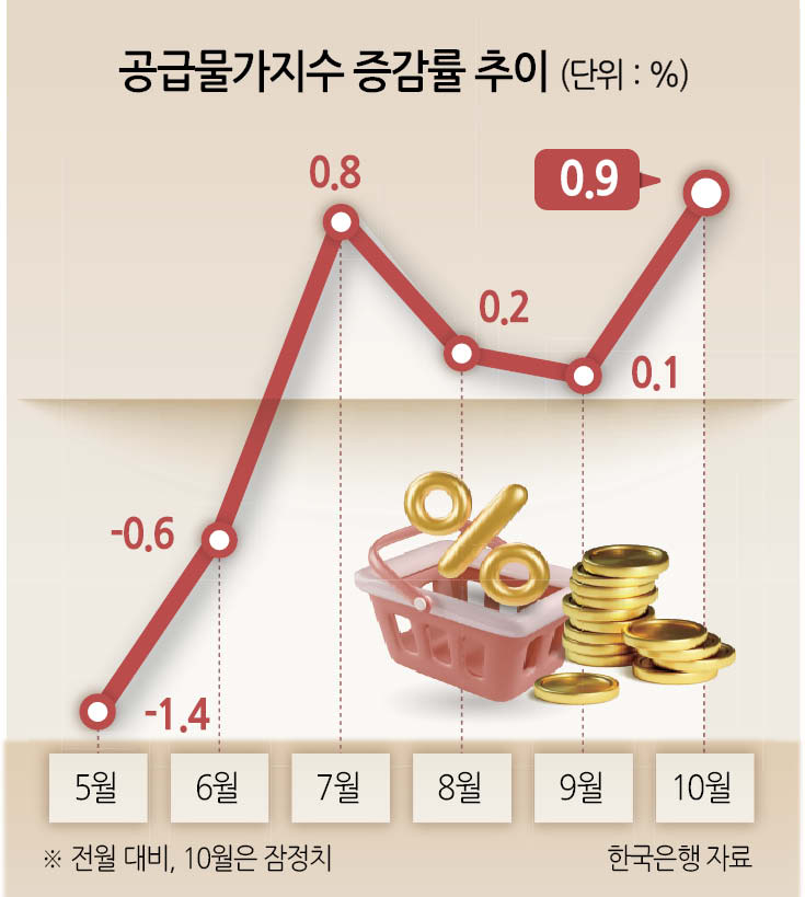 21일 한국은행에 따르면 10월 국내 공급물가지수는 125.18로 전월(124.11)보다 0.9% 오른 것으로 잠정 집계됐다.