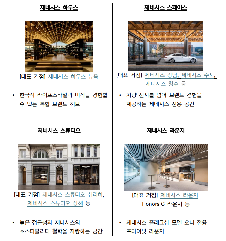 제네시스는 현재 ‘고객 경험’ 확장에도 많은 투자를 이어가고 있다. 국내외에 ‘제네시스 하우스·스페이스·스튜디오·라운지’ 등 체험 공간을 150개 이상 운영하며, 단순 전시를 넘어 디자인·예술·한국적 환대를 결합한 복합 문화공간으로 브랜드 가치를 전달한다.