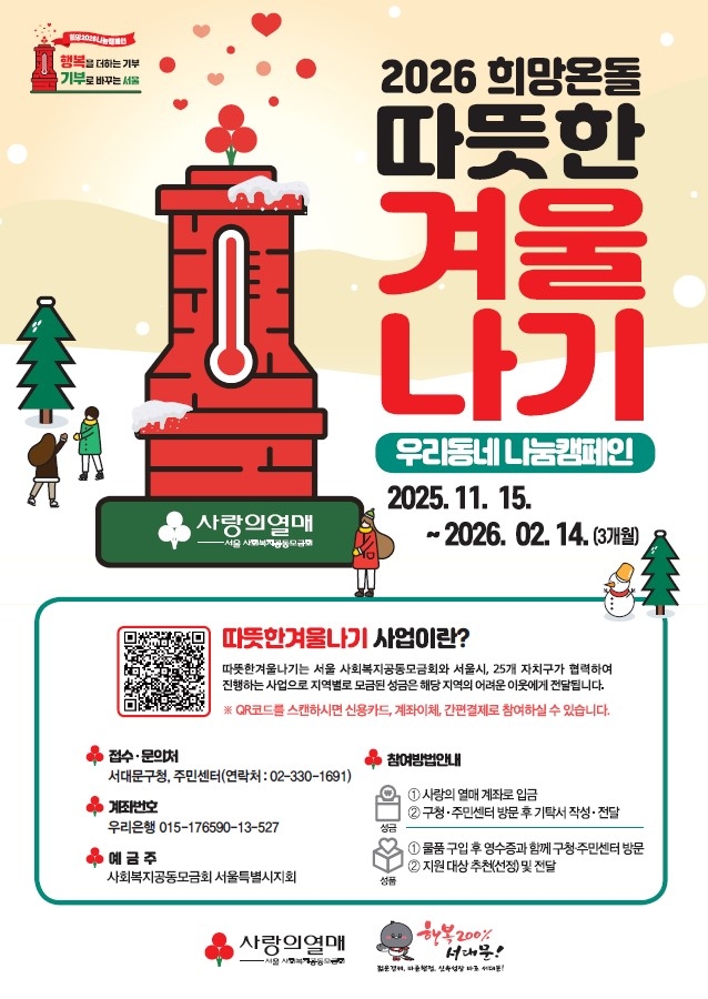 ‘2026 희망온돌 따뜻한 겨울나기’ 사업에 관한 자세한 내용은 서대문구청 인생케어과(02-330-1691)로 문의하면 된다.