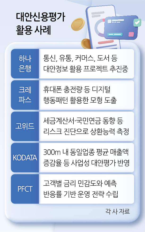 금융당국에서도 대안신용평가 모델을 활성화하는 방안을 고심하고 있다. 금융위 한 관계자는 “대안신용평가는 커버리지(범위)나 정확성, 그리고 어떤 정보를 공급하고, 그 정보를 어떤 파이프라인으로 공급해야 하는지 등 복잡한 이슈가 있다”며 “대안신용평가를 활성화하기 위해 종합적으로 필요한 부분을 어떻게 지원해줄 수 있을지 살펴보고 있다”고 말했다.