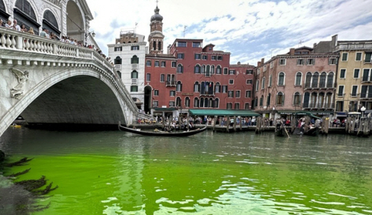 | 2023년 이탈리아 베네치아 대운하 강물에 녹색 물질이 퍼져 현지 당국이 조사에 나선 당시의 모습. [AP·연합] |
