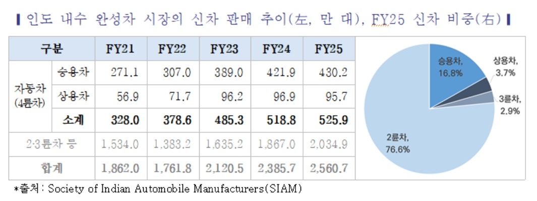 지난해 4월부터 올해 3월까지 인도에서 자동차(사륜차)는 525만9000대가 팔렸고 이륜차, 삼륜차 등은 총 2034만9000대 판매됐다.