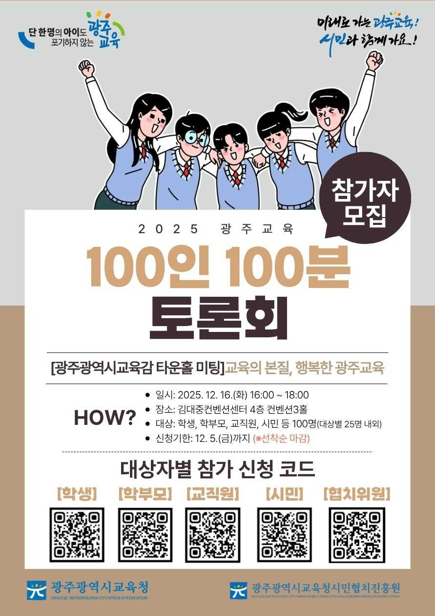 [헤럴드경제(광주)=서인주 기자] 광주시교육청시민협치진흥원(이하 시민협치진흥원)은 오는 12월 16일 김대중컨벤션센터 4층 컨벤션홀에서 ‘2025 광주교육 100인 100분 토론회’를 개최한다.