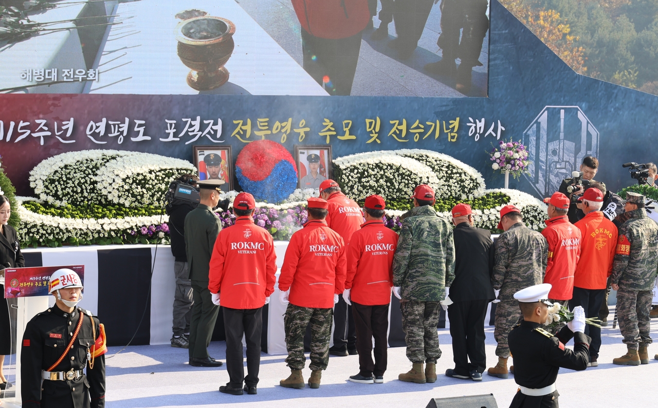 | 23일 대전 유성구 국립대전현충원에서 제15회 연평도 포격전 전투 영웅 추모 및 전승 기념식이 거행되고 있다. [연합] |
