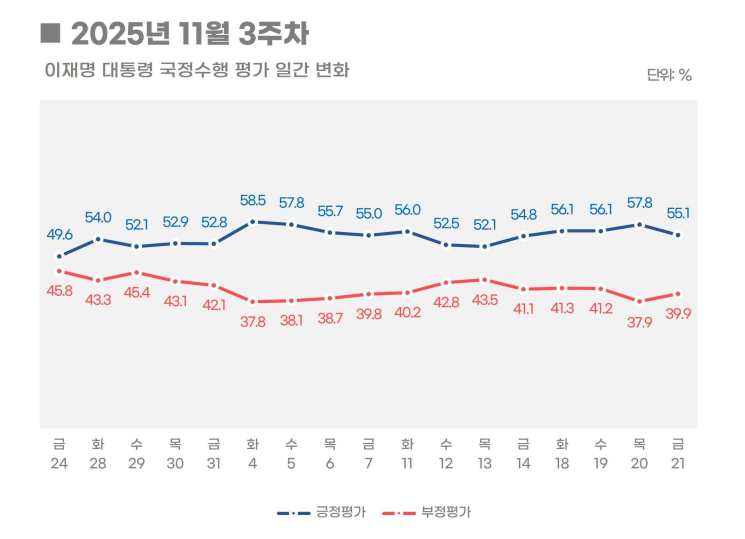 리얼미터가 에너지경제신문 의뢰로 지난 17일부터 21일까지 전국 18세 이상 유권자 2523명을 대상으로 이 대통령의 국정수행 지지도를 조사한 결과(11월 3주차 정례 조사) 긍정 평가가 55.9%(매우 잘함 46.4%, 잘하는 편 9.5%)로 나타났다. (신뢰수준 95%, 표본오차 ±2.0%p) 반면 ‘잘못하고 있다’는 부정 평가(매우 잘못함 31.9%, 잘못하는 편 8.6%)는 40.5%로 집계됐다.