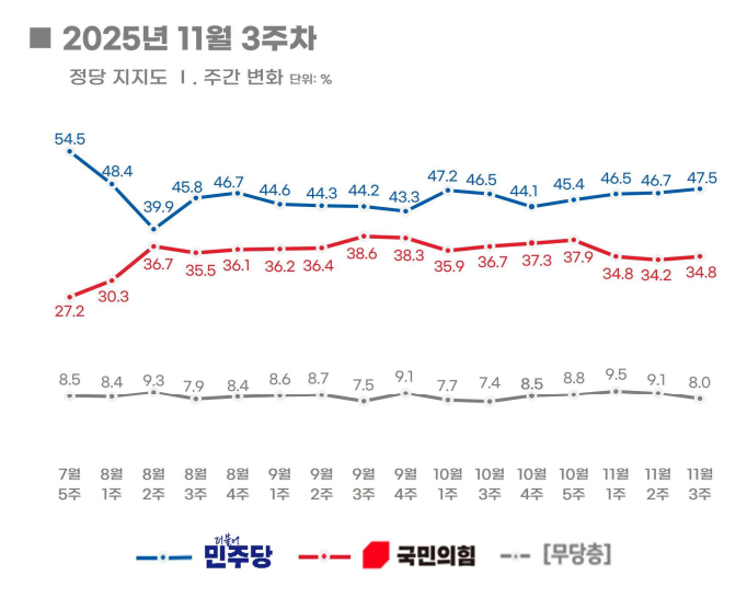 정당 지지도 조사(11월 3주차)에선 더불어민주당 47.5%, 국민의힘 34.8%로 각각 조사됐다. 직전 조사(11월 2주차)에서 민주당은 46.7%, 국민의힘은 34.2%였다. 정당 지지도 조사는 지난 20~21일 전국 18세 이상 유권자 1004명을 대상으로 진행됐다. (신뢰수준 95%, 표본오차 ±3.1%p)