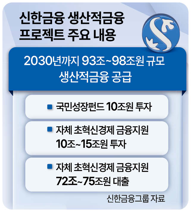 신한금융은 진옥동 회장의 주도 아래 생산·포용적 금융 사업인 ‘신한 K-성장! K-금융! 프로젝트’에 속도를 내고 있다. 그중에서 신한금융은 국가 핵심 산업의 혁신 역량을 높이기 위해 2030년까지 93조~98조원 규모의 생산적 금융을 단계적으로 공급하고 있다. 특히 향후 5년간의 경제 상황과 산업구조 변화 등을 고려해 그룹의 자체적인 금융지원 규모를 탄력적으로 운용할 계획이다.