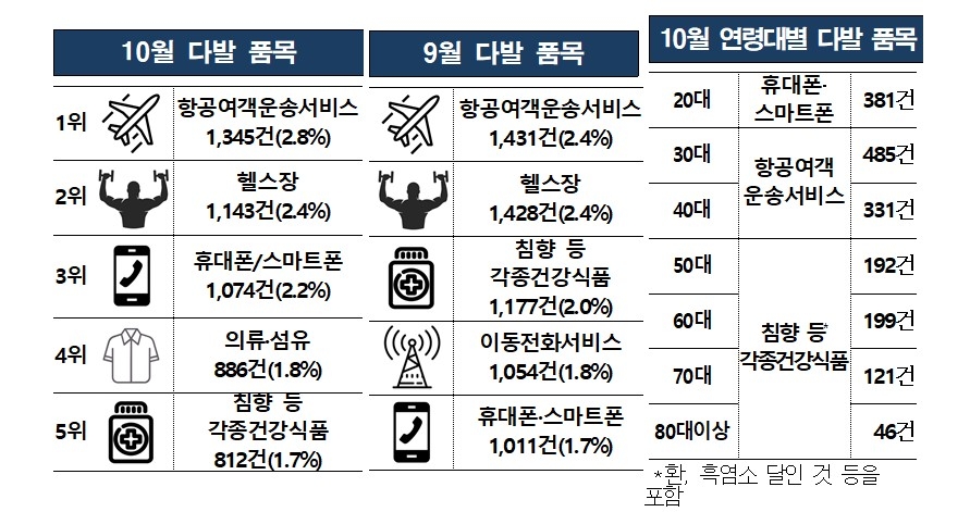 지난달 상담 다발 품목은 ‘항공 여객 운송 서비스’(1345건·2.8%)와 ‘헬스장’(1143건·2.4%)으로 전달과 동일하게 각각 1, 2위를 유지했다.