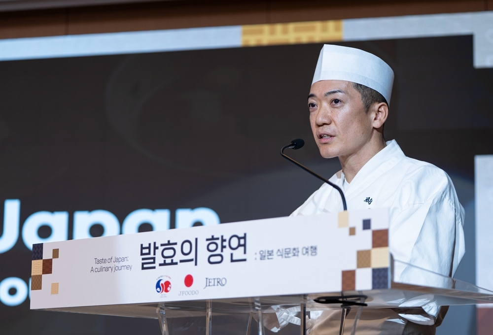 | 나카무라 코우지 셰프가 행사에서 한일국교정상화 60주년 기념 식문화 교류행사에서 일본 식문화에 대해 발표하고 있다. |