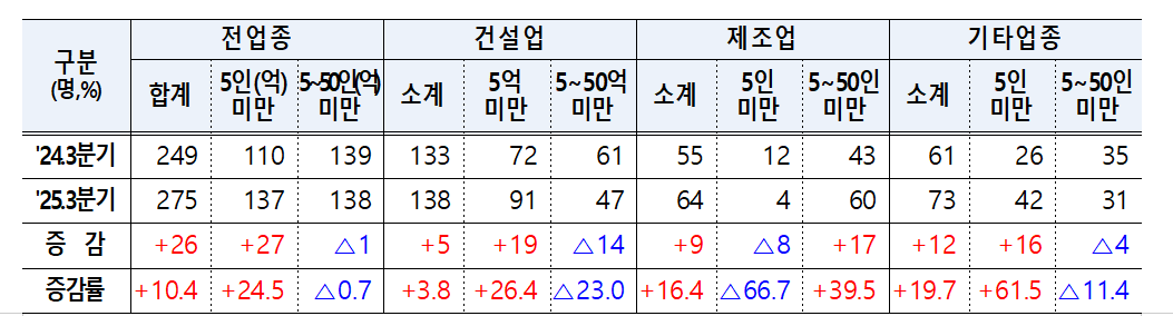 고용노동부가 25일 발표한 ‘2025년 3분기 재해조사 대상 사망사고 발생 현황(잠정결과)’에 따르면, 5인 미만 사업장 사고사망자는 전년 77명에서 올해 99명으로 22명 증가(+28.6%)했다. 같은 기간 50인 미만 사업장은 26명 늘어난 반면, 50인 이상 사업장은 12명 감소했다.